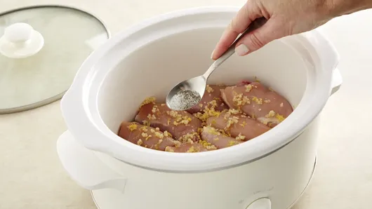Step1Spray 3- to 4-quart slow cooker with cooking spray. Place chicken thighs in slow cooker; sprinkle with grated lemon peel, garlic, 1/4 teaspoon of the salt and the pepper. Pour chicken broth over chicken.