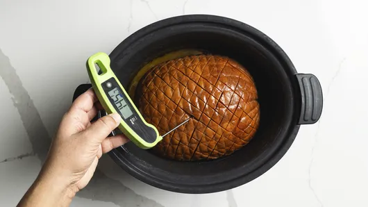 Pour the glaze over the ham, cover, and let the slow cooker gently heat everything together on the low heat setting for 3 to 4 hours, until the ham is warmed through and flavorful, and a thermometer inserted in the middle of the ham reads 140°F. As the ham cooks, we recommend brushing the ham a couple of times with the liquid from the bottom to keep it moist.