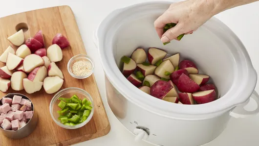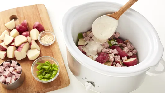 Step1Spray 3 1/2- to 4-quart slow cooker with cooking spray. Layer half each of the potatoes, bell pepper and ham in slow cooker. Sprinkle with half of the onion.