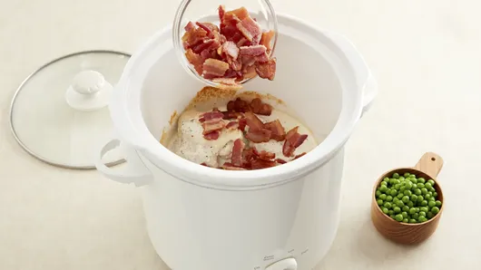Stir 3/4 cup of the bacon and the frozen sweet peas into chicken mixture; mix well. Increase heat setting to High; cover and cook 10 to 15 minutes or until peas are cooked.