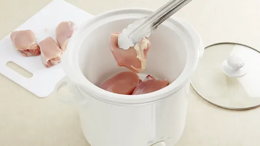 Spray bottom of 3- to 4-quart slow cooker with cooking spray. Add chicken thighs to slow cooker.