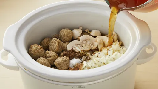 In 5-quart slow cooker, mix meatballs, mushrooms, onion, broth, Worcestershire sauce, nutmeg, allspice, salt and pepper.