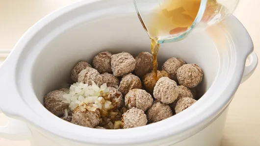 Step1Spray 3 1/2- to 4-quart slow cooker with cooking spray. Place meatballs and onion in slow cooker. Stir in broth, Worcestershire sauce and nutmeg.