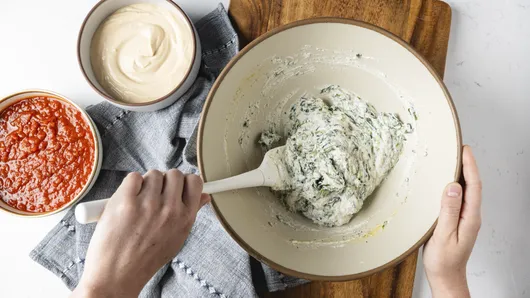 In a large bowl, mix together the ricotta, squeezed spinach, egg, salt, pepper, Italian seasoning, garlic powder, and onion powder. Set aside.