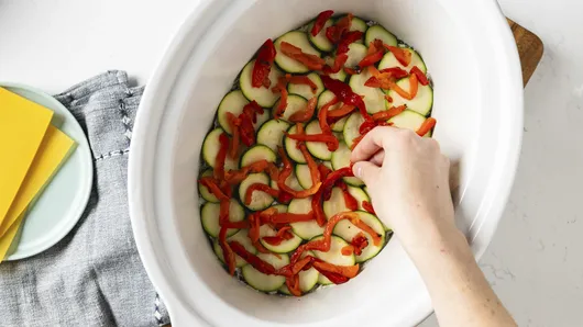 Start layering the lasagna. Add a layer of noodles over the sauce, breaking them to fit the shape of the slow cooker and trying to cover as much of the sauce as possible (it’s ok if they overlap a little). Add 1/3 of the ricotta mixture (about 1 cup) over the noodles and spread gently to cover. Add about 1/3 of the zucchini slices over the ricotta, then distribute about 1/3 of the red peppers on top. Top the vegetables with about 1/4 of the mozzarella (about 1 cup), distributing it evenly. Use a ladle or a spoon to dollop about 3/4 cup of sauce over the cheese.