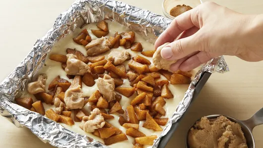 Spoon cooled apple mixture evenly over cream cheese mixture. Crumble and sprinkle reserved 1/2 cup dough over apples. Sprinkle with cinnamon-sugar mixture.