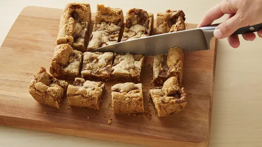 Step3Bake 28 to 32 minutes or until top is golden brown and toothpick inserted two inches from sides comes out almost clean. Cool completely, about 2 hours. Remove bars from pan; cut into 4 rows by 4 rows to serve.