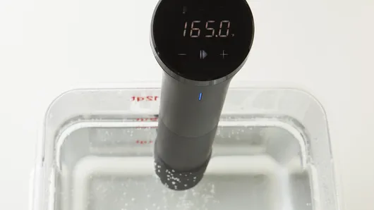 Fill stockpot or deep polycarbonate food-safe container with hot tap water according to sous vide machine’s manufacturer’s instructions. Set sous vide machine temperature to 165°F.