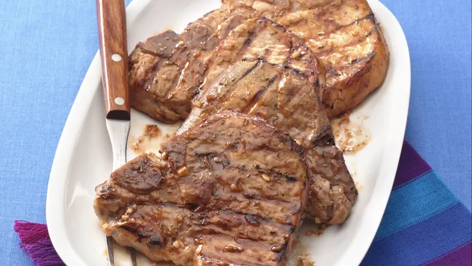Step1Heat grill. Place pork chops in shallow glass baking dish; pour soy sauce over pork. Let stand at room temperature for 15 minutes to marinate.