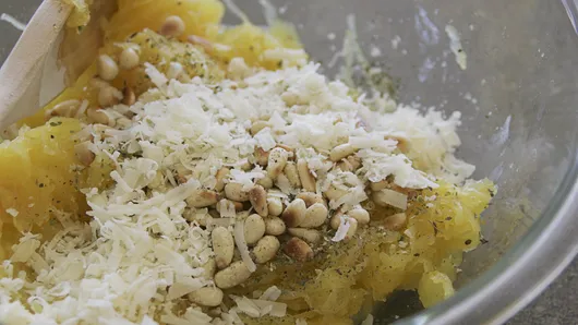 Step5Cut butter into small cubes, and add to warm squash. Stir in gently to melt butter. Add pine nuts, Parmesan cheese, basil and oregano. Season to taste with salt and pepper. Serve warm.