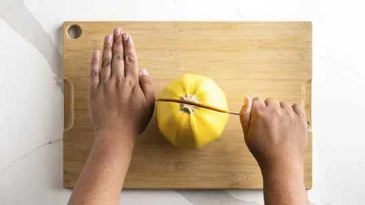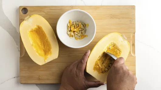 Heat oven to 375°F. Cut squash in half lengthwise with sharp knife.