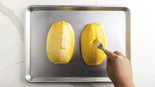Bake 45 to 50 minutes or until fork pierces flesh of squash easily. Remove squash from oven. Carefully turn squash over to cool for 10 minutes.