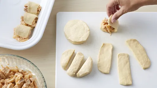 Step3Separate dough into 8 biscuits. Cut each biscuit into 3 strips. Press each strip into 4x2-inch rectangle. Place 1 heaping tablespoonful chicken mixture on one half of each rectangle. Fold dough over filling (do not seal), and place in baking dish in 6 rows by 4 rows.