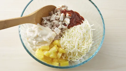 Step2In medium bowl, mix chicken, cheese, pineapple tidbits, mayonnaise and Sriracha sauce.