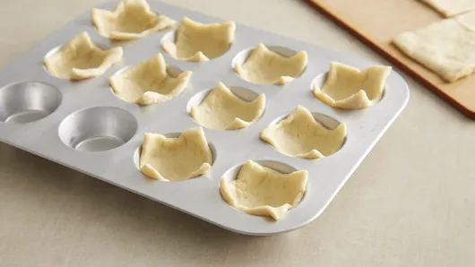 Step3Gently press squares into mini muffin cups and three-fourths of the way up sides.
