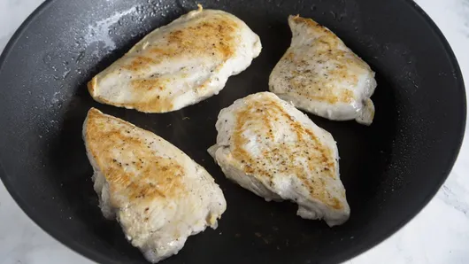 Step1Heat 10-inch skillet over medium-high heat. Add 2 tablespoons vegetable oil, swirling to coat. Sprinkle 4 to 6 boneless skinless chicken breasts on both sides with salt and pepper. Cook in oil 10 to 12 minutes, turning once, until juice of chicken is clear when center of thickest part is cut (at least 165°F). Remove from skillet; cover with foil to keep warm.
