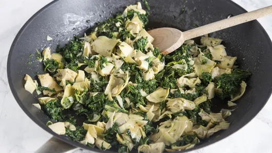 Step2In same skillet, add 1 box (10 oz) frozen chopped spinach, thawed and squeezed to drain, and 1 jar (14 oz) marinated artichoke hearts, chopped. Cook 2 to 3 minutes or until heated through.