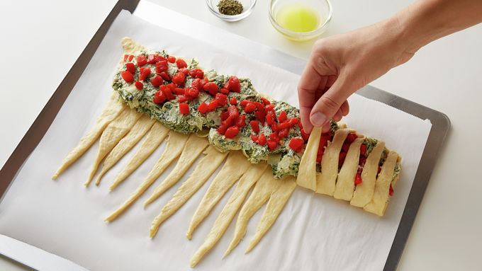 Your favorite party dip is now baked and served inside a candy cane-shaped crescent! Spread a creamy spinach-artichoke mixture onto Pillsbury™ crescent dough, then top with cheese and peppers. Fold and bake dough into a buttery, golden brown candy cane, and serve as a festive appetizer at your next holiday gathering. MORE+ LESS-