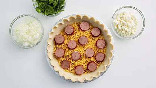 Cover bottom of pie crust with crushed croutons; sprinkle with Cheddar cheese. Layer sausage slices on cheese; top with spinach, onion and feta cheese.