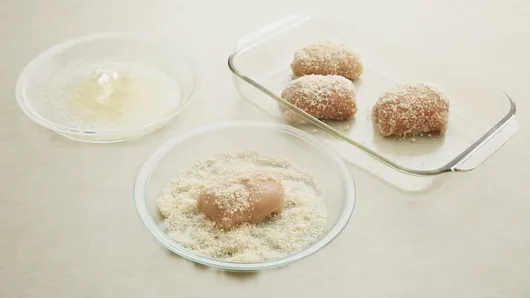 Step4On shallow plate, mix bread crumbs and Parmesan cheese. Roll chicken in melted butter, then coat with bread crumb mixture. Place seam sides down in baking dish.