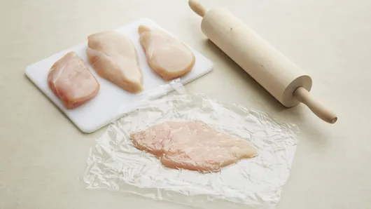 Step2Between pieces of plastic wrap or waxed paper, place each chicken breast smooth side down; gently pound with flat side of meat mallet or rolling pin until about 1/8 inch thick. Sprinkle with garlic salt.