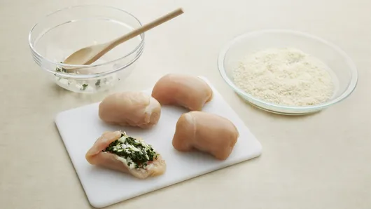 Step3Place 1/4 of the spinach mixture on center of each flattened chicken breast. Fold in sides; fold up top and bottom, overlapping in center.