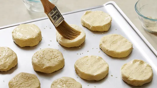 Step1Heat oven to 400°F. Separate dough into 10 biscuits; place 2 inches apart on ungreased cookie sheet. Brush tops of biscuits with 1 teaspoon of the oil. Sprinkle with sesame seed; press in lightly. Bake 8 to 11 minutes or until golden brown.