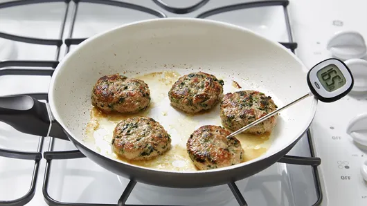 Step3In 10-inch nonstick skillet, heat 2 tablespoons of the oil over medium-high heat. Add 5 patties; cook 4 to 6 minutes, turning once, until meat thermometer inserted in center of patties reads 165°F. Drain on paper towel-lined plate. Repeat with remaining oil and patties.