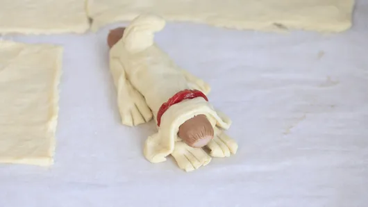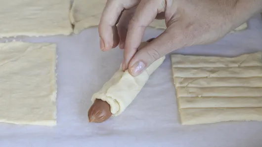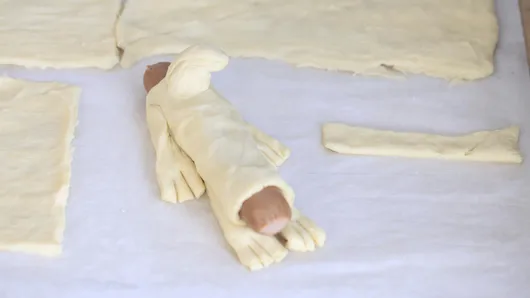 Step1Heat oven to 375°F. Separate dough into 4 rectangles. Firmly press perforations to seal. Cut 2 of the rectangles in half crosswise to make 4 smaller rectangles. Wrap 1 rectangle around each hot dog. Pinch dough to seal. Place seam side down on ungreased cookie sheet for dog bodies.