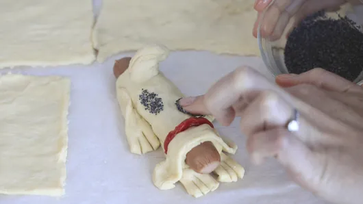 Step4Place 1 red pepper strip directly behind ears on each to make collar. Press poppy seed on dough to make spots.