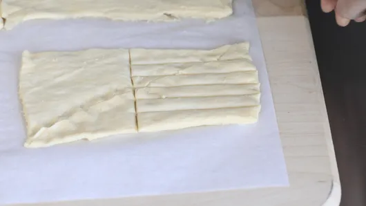 Step2Cut remaining 2 rectangles in half crosswise to make 4 smaller rectangles. Cut each smaller rectangle lengthwise into 6 strips to make total of 24 strips.