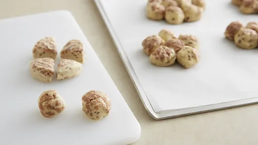 Step1Heat oven to 400°F. Spray large cookie sheet with cooking spray. Separate dough into 8 rolls. Use kitchen scissors or knife to cut each roll into 4 pieces.