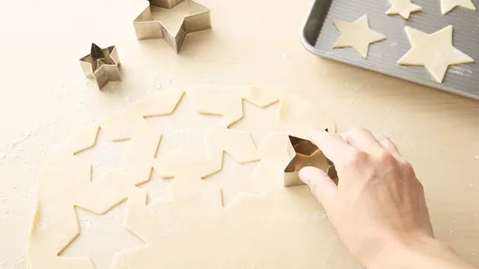 Step3Meanwhile, remove another pie crust from pouch. On lightly floured surface, unroll crust. Roll to 12-inch circle. Cut stars using 1-, 1 1/2- and 2-inch cookie cutters. Place 1 inch apart on large ungreased cookie sheet. Brush with water; sprinkle with 1 tablespoon of the sugar.