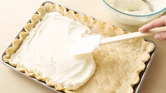 Step1Heat oven to 450°F. Remove 2 of the pie crusts from pouches. Unroll and stack on lightly floured surface. Roll to 17x12-inch rectangle. Fit crust into ungreased 15x10x1-inch pan, pressing into corners. Fold crust even with edges of pan. Prick crust several times with fork.