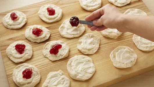 Separate dough into 8 biscuits; split biscuits in half, making total of 16 biscuit rounds. Place on work surface or cutting board. Press dough into 4-inch circles; spread generous teaspoon of the cream cheese mixture and 1 teaspoon of the jam on one side of 15 of the biscuit rounds.