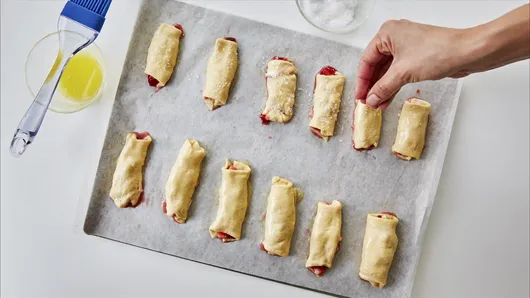 Step3Roll up each rectangle, starting with shortest side, and pinch seam to seal. Place on cookie sheet, seam side down. Brush with butter, and sprinkle with sugar.