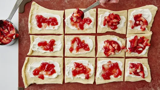 Step2Unroll dough on work surface. Cut dough into 12 rectangles (2 cuts lengthwise and 3 cuts crosswise). In small microwavable bowl, microwave cream cheese uncovered on High 20 seconds to soften. Spread about 2 teaspoons cream cheese over each dough rectangle to 1/4 inch of edge. Gently spread about 1/2 teaspoon jam over cream cheese. Place about 2 teaspoons strawberries in center of each square; spread slightly.