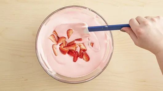 Step3Stir whipped topping into gelatin mixture until well blended. Fold in sliced strawberries. Spoon into cooled baked shell. Arrange strawberry halves around outer edge of pie. Refrigerate at least 2 hours or until serving time. Store in refrigerator.