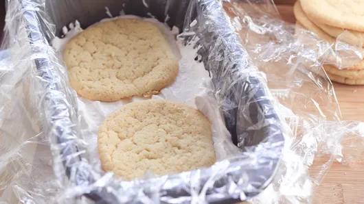 While cookies bake and cool, line 9x5-inch loaf pan completely with plastic wrap overhanging sides with enough to wrap cake. Add 1/2 cup strawberry jam or preserves to 1 container (16 oz) thawed frozen whipped topping; using large rubber spatula, fold to combine well.