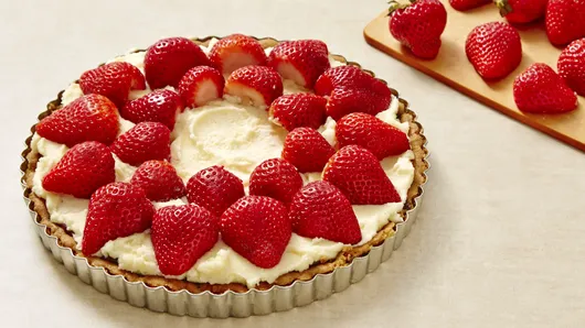 Step3Reserve 2 teaspoons of the hazelnut spread. Spread remaining hazelnut spread evenly in bottom of cooled cookie crust. Spoon and carefully spread mascarpone mixture over hazelnut spread to within 1/4 inch from edge. Arrange strawberries over mascarpone.
