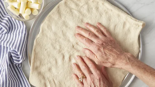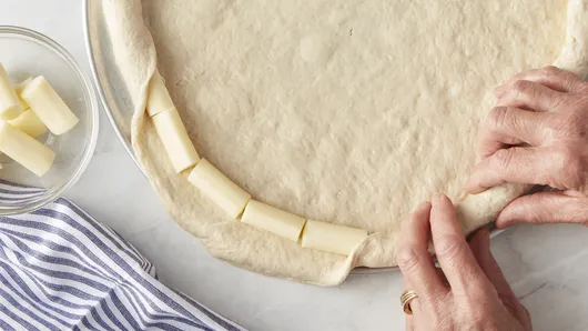 Step2Place string cheese around inside edge of crust. Fold extended edge of dough over cheese; pinch firmly to seal.
