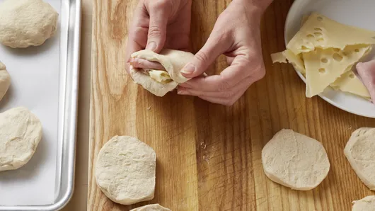 Step3Place 1 folded slice of cheese and 1 folded slice of ham on 1 biscuit round. Top with another biscuit round; firmly pinch edges to seal. Repeat with remaining cheese, ham and biscuits to make 8 sandwiches. Place on cookie sheet.