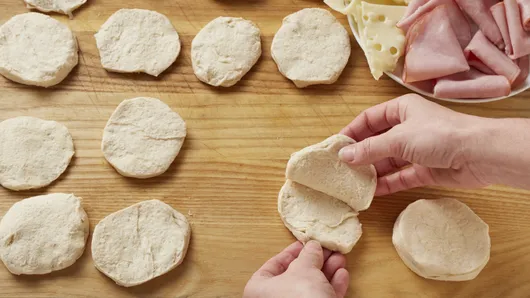 Step2Separate dough into 8 biscuits. Separate each biscuit into 2 layers, making total of 16 biscuit rounds. Fold each piece of cheese in half. Fold each piece of ham into fourths.