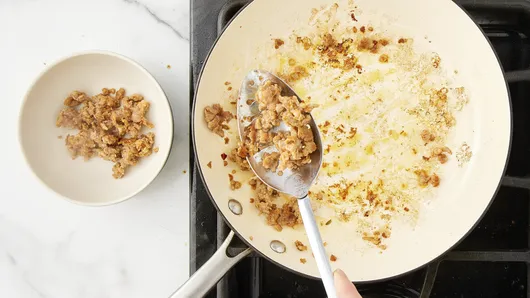 Heat oven to 375°F. Spray 2-quart glass baking dish with cooking spray. In 10-inch skillet, heat oil over medium-high heat. Add sausage, and cook 3 to 5 minutes, stirring occasionally, until no longer pink. Using slotted spoon, transfer to small bowl.