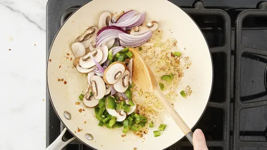 Add mushrooms, onion and bell pepper to drippings in skillet; cook 2 to 4 minutes, stirring frequently, until softened and browned; remove from heat.