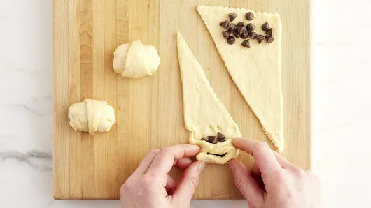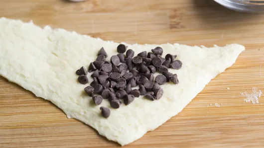 Step2Unroll crescent dough onto work surface; separate into 8 triangles. Place about 2 teaspoons chocolate chips on shortest side of each triangle.