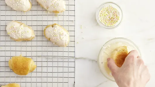 Step5In small microwavable bowl, microwave frosting uncovered on High 10 to 15 seconds, stirring until smooth and dipping consistency. Dip tops of crescent eggs into frosting, shaking off excess. Sprinkle with colored sugars or candy sprinkles. Serve warm. Store in covered container at room temperature.