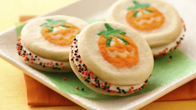 Step3Bake 6 to 10 minutes or until set. While still warm, cut cookies with 3-inch pumpkin-shaped cookie cutter. In 6 of the cookies, use small round cookie cutter to cut out center of pumpkin. Gently remove cutout portion of cookie. Cool 5 minutes; remove from cookie sheet to cooling rack. Cool completely.
