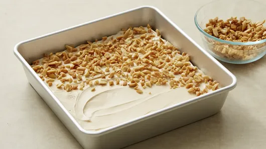Step3Meanwhile, in small bowl, mix frosting and remaining 1 teaspoon maple extract until smooth. In another small bowl, mix peanuts, toffee bits and 1/2 teaspoon salt. Spread frosting evenly over cooled bars. Sprinkle with peanut mixture; press in lightly. Refrigerate about 30 minutes before cutting. Cut into 4 rows by 4 rows. Store covered.