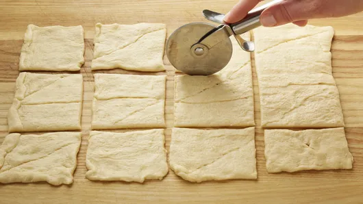 Step3Unroll dough on cutting board. Press into 12x8-inch rectangle. Firmly press perforations to seal. With pizza cutter or sharp knife, cut into 12 squares.